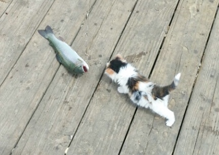 | fish fishing stalk stalking kitty kitten cat dock lake trick tricks agility |