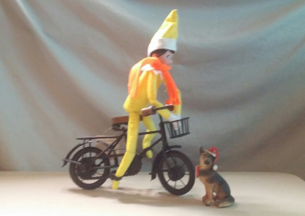 | elf on bicycle bike german shepherd dog elf shelf yellow christmas |