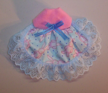 These little dresses are made in a variety of ways. This one is a Easter Bunny Print Skirt trimmed with LIGHT BLUE lace and has a PINK polar fleece top complete with a Cute BLUE bow "belt".