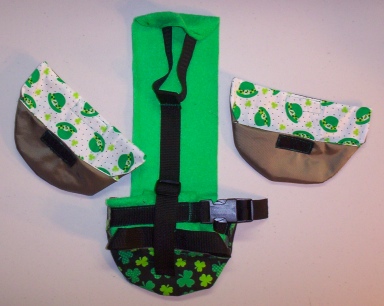This Goose Diaper Holder Harness is made with St.Pat's Day Print, backed with a waterproof fabric This Goose Diaper Holder can be lined with a sanitary napkin, a human baby diaper, a folded newspaper page.