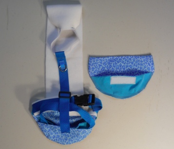 This Goose Diaper Holder Harness is made with Blue Leopard Print, backed with a waterproof fabric and it is oh so cute. This Goose Diaper Holder can be lined with a sanitary napkin, a human baby diaper, a folded newspaper page, other folded papers or nothing at all (using the liners as a cloth diaper).