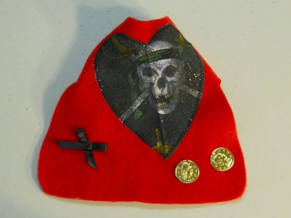 These little coats are made in a variety of ways. This one has a heart shaped PiRATe Print fabric over Red Polar Fleece. It has a cute little Black Bow Tie on one hip and "bootie" on the other; two little golden (colored) coins sewn on.