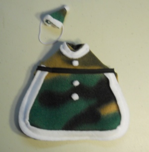 All of my items are my own design and pattern. This is a cute little idea was Santa Inspired. It is made as you see in the photo. The matching hat has adjustable elastic.