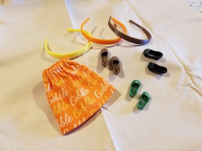 With this lot you will receive what you see in the photo. The cute and whimsical Gobble, Gobble, Thanksgiving Print Skirt, the 3 Pair of Shoes (that click on from the little toe over and STAY on the foot!) Brown, Black and Forest Green and the Headbands, yellow, orange and brown.