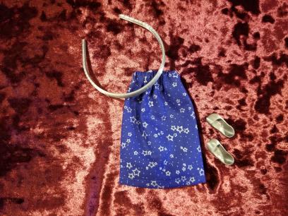 With this lot you will receive what you see in the photo. The cute little Night Starts Print Skirt, the METALLIC SILVER Pair of Shoes (that click on from the little toe over and STAY on the foot!) as well as the matching Headband.
