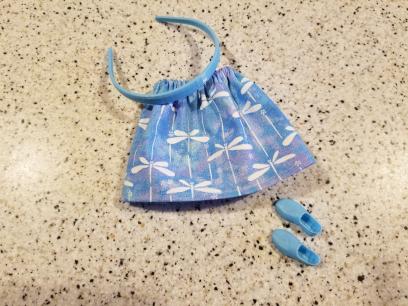 With this lot you will receive what you see in the photo. The cute little Dragonfly Print Skirt, and the Light Blue Pair of Shoes (that click on from the little toe over and STAY on the foot!) AND! The Light Blue Headband.