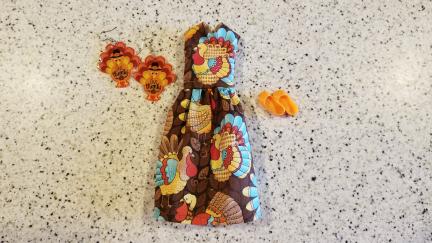 The Dress and Stockings made to fit any of the Neo Blythe Dolls types of Bodies. It is a VERY Whimsical Turkey Print Dress with Big Turkey "Give Thanks" Earrings and a pair of Cute Orange Shoes to match.