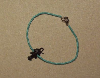 This is a cute little bracelet made of turquoise seed beads with a black approx 1" charm. The bracelet is approx. 8 1/4" long. This bracelet has a "lobster claw" closure.